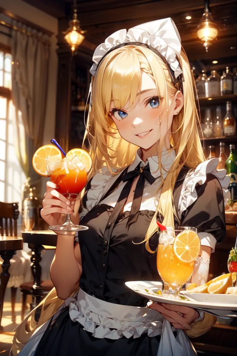 Liliana, a charming maid waitress with golden locks and a captivating smile, exudes elegance and warmth in her crisp uniform